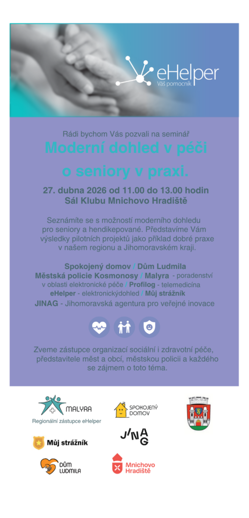 Srdečně Vás zveme na odborný seminář „Moderní dohled v péči o seniory v praxi“, který se uskuteční 27. dubna 2026 od 11.00 do 13.00 hodin v sále Klubu Mnichovo Hradiště.